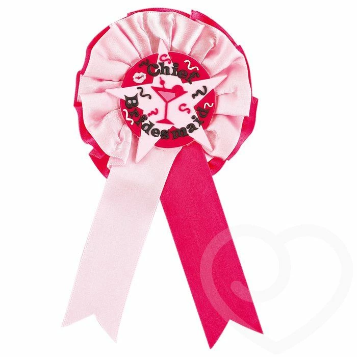 A baby pink and fuchsia rosette with rubber Chief Bridesmaid emblem to help her stand out at the Hen Party. Printed with cool cocktail glass design your bridesmaid will feel pretty and proud with this fun Hen Night badge.