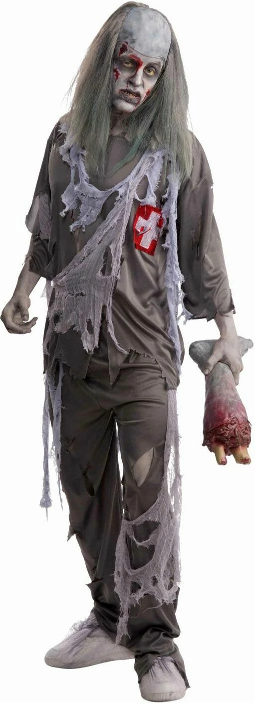 This Zombie Doctor does not want to help his patience he wants to eat them.Zombie Doctor Adult Costume includes tattered grey top with red medial cross at front and attached tattered gauze and matching grey pants with attached tattered gauze. This Zombie Costume for men is available in adult standard size (fits up to chest size 42).Please note wig leg prop makeup and shoes are not included.This is STANDARD size costume and usually fits size M/L